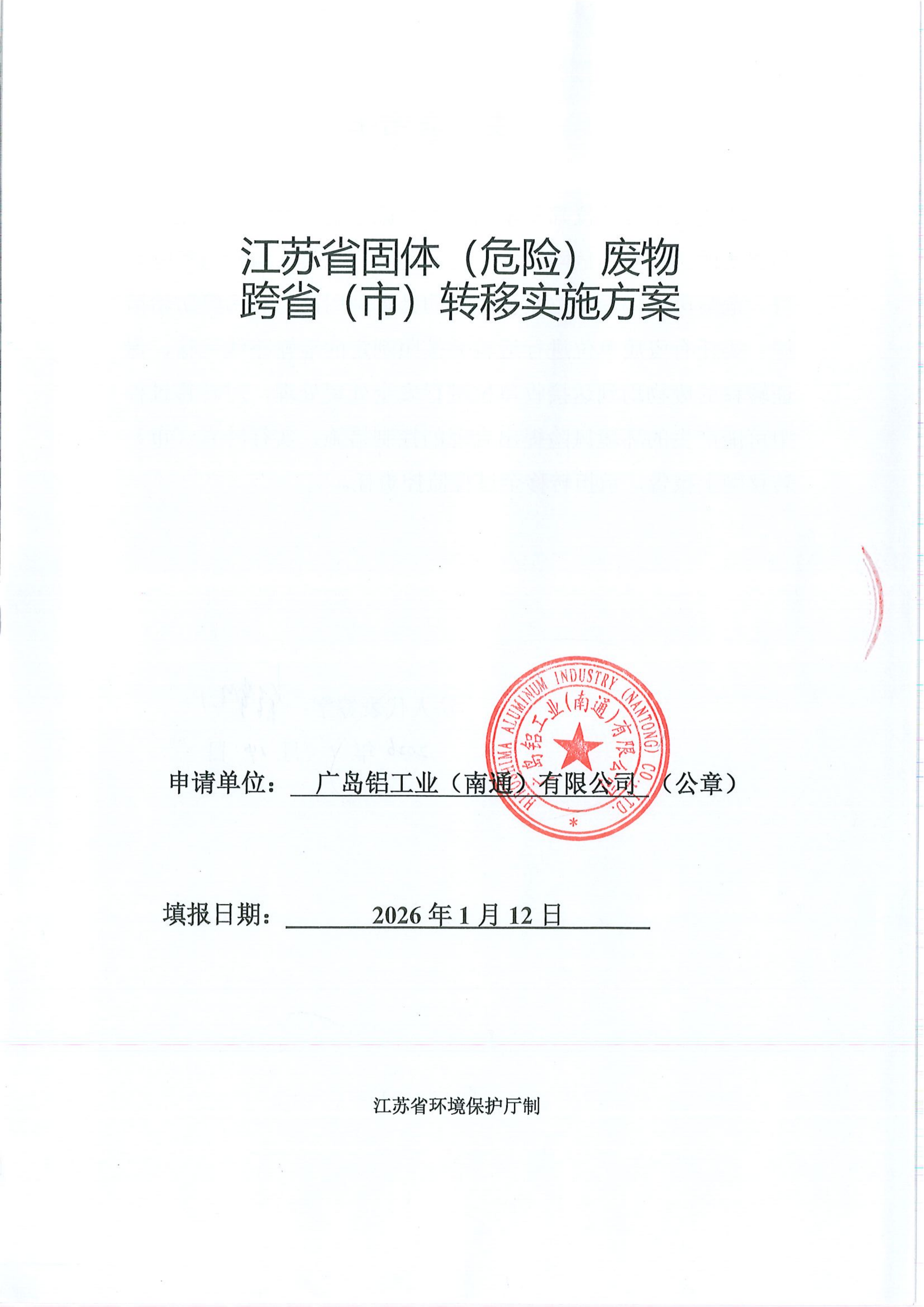 廣島鋁工業(yè)(南通)有限公司固體(危險廢物)廢物跨省轉移實施方案(2026年計劃)